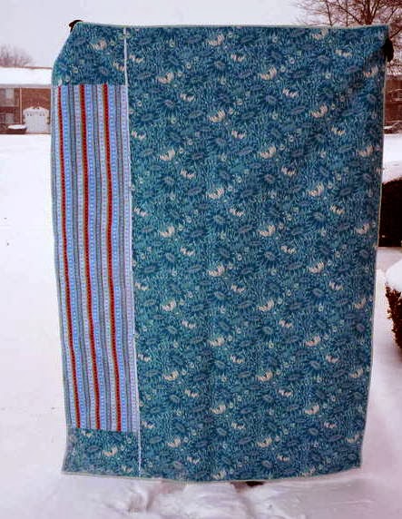 I quilted this based on Barbara Persing's suggestion when she visited my guild: all-over swirls to signify wind. I also threw in some snowflakes to break up the monotony of quilting swirls on a large couch quilt. I quite like the snowflakes' randomness. See them above (especially clear in the large border)?