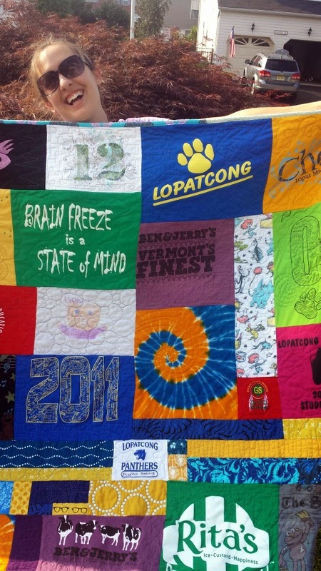 Designed by Marisa (my almost-senior-in-high-school sister) and sewn and quilted together by me on my home machine, this is her t-shirt quilt!