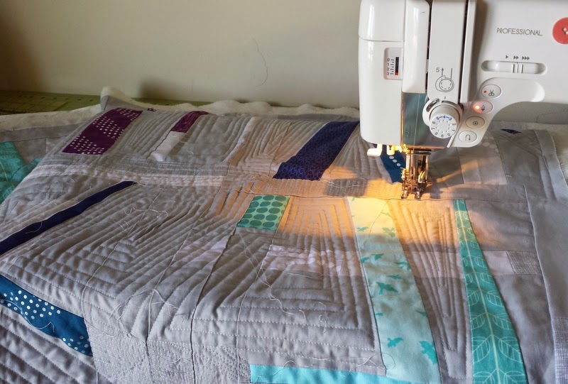 Well, mostly. I'm making use of my darning/free motion foot for some match stick quilting a la Leanne, just to mix things up. The walking foot quilting is specifically inspired by Jacquie Gering, namely her "Shattered" quilt. During the "Slice and Insert" workshop, she pointed out how the shapes were forming between the colored lines. Thus, I felt that this quilting would accentuate the quilt the most. And it's fun! No measurements, just guide and go.
