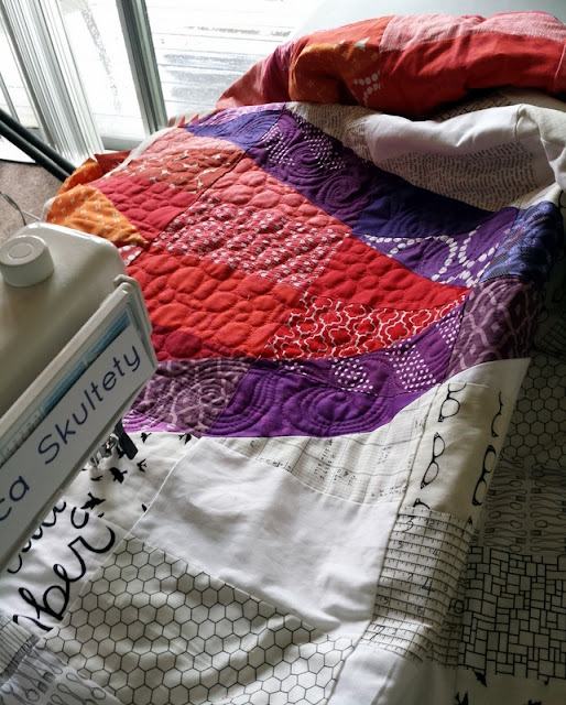 I quilted each section in a different motif, too: orange squares, red pebbles, and long purple swirls.