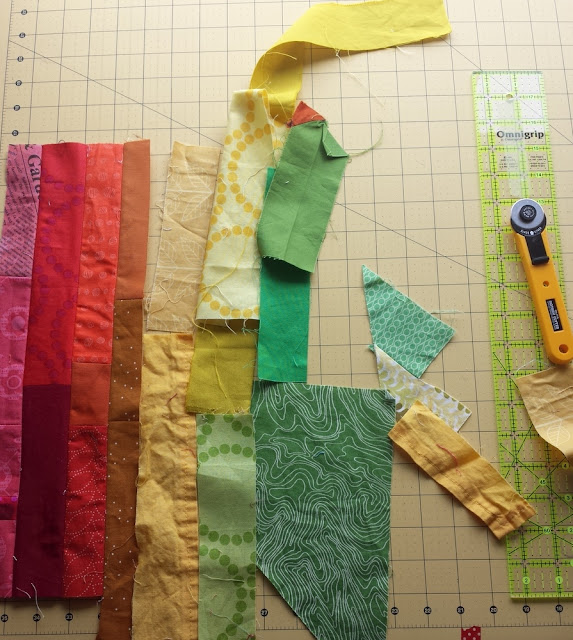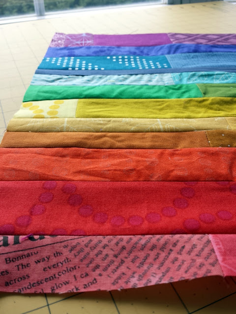 I am itching to finish and quilt this for the Rainbow Mini Quilt Swap at Mid-Atlantic Mod retreat in April. Whoever gets mine will be taking home a little bit of trademark me, plus some exciting quilting - can you guess what the next addition will be?