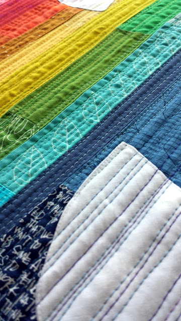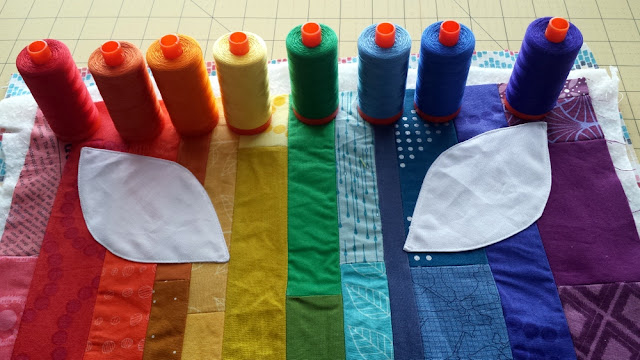 I used several different Aurifil 50 weight threads to create ANOTHER rainbow. I made sure to overlap thread colors to create a truly cohesive rainbow. This is why I love quilting things; it became a whole new piece with randomly-spaced straight line stitching (borderline matchstick quilting). Truly - #quiltthelifeintoit!