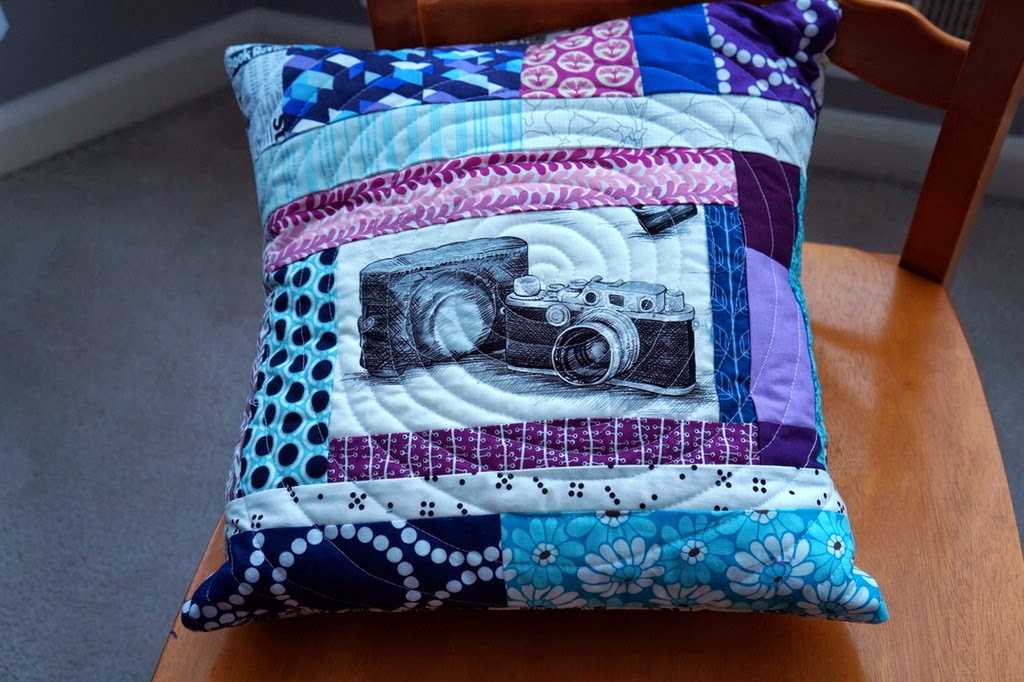 ReplyDeleteWhat a great pillow! I love the camera fabric, and the purples are lovely!