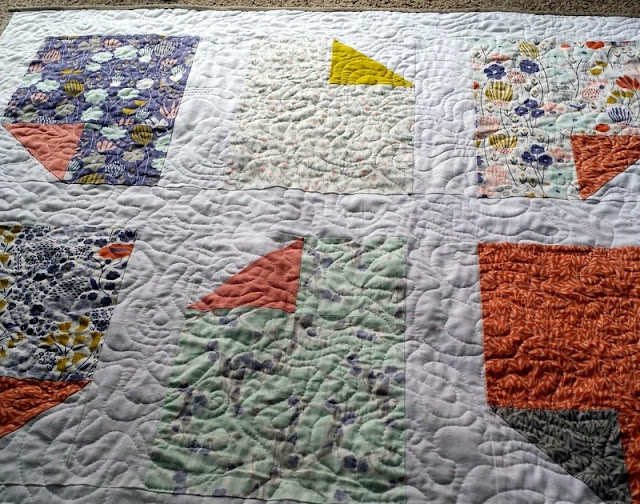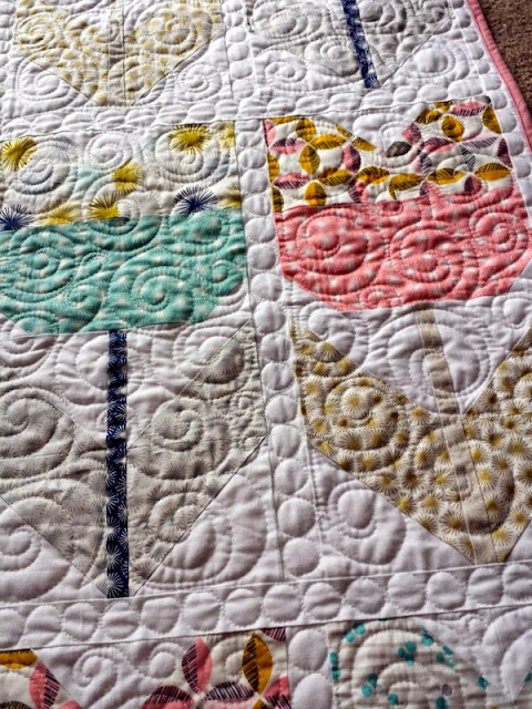 These colors would make a great baby quilt such as this one. The piecing took longer than the other quilt (lots of HSTs) but it was fun to see tulips popping up on my floor/design wall. I really took advantage of the white space on this one; I pebbled in the sashing to make it pop.