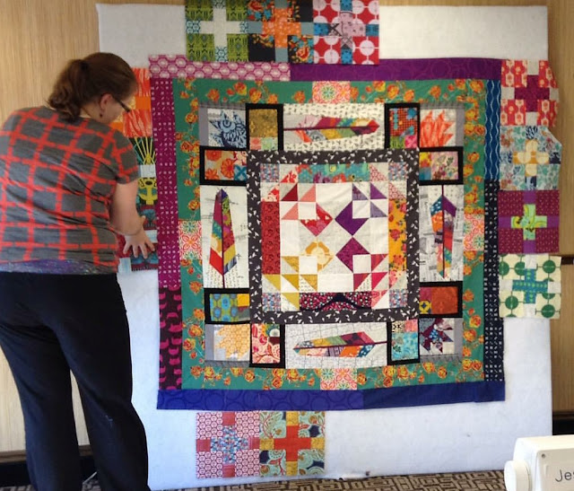 I'm in the middle of my epic Anna Maria Horner quilt, and I'm loving every second (even though it sat in time out for a good year and a half). Here's a snapshot of me working on it at our recent CJMQG retreat (thanks Laura!).