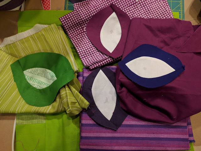 I had forgotten how much I LOVE sewing improv curves, and, well, curves in general. Once you get the hang of it, it's quite fun. So I set to work creating 3 white and purple petals and one green petal falling off (why purple? Because it's the best color, and it looks amazing with green!). I adhered Heat N Bond Lite to the backs of the peels before raw-edge-appliqueing them onto an improvised green background. Some of the background scraps disappeared under the applique, but I was prepared for that.