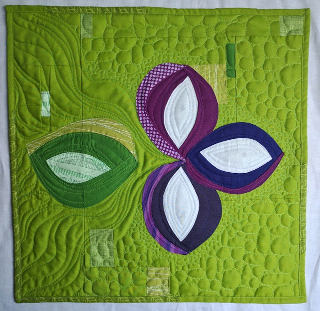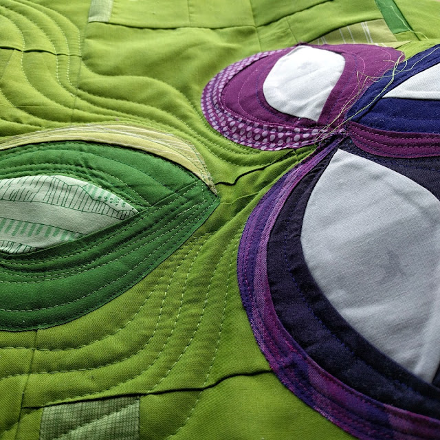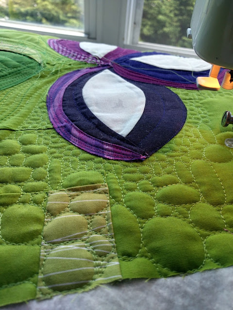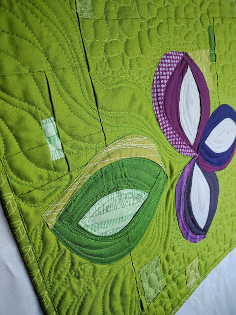 Finally, I decided to quilt the whole thing to emphasize the falling petal (with wavy lines, one of my favorite FMQ motifs). Instead of just pebbling around the rest of the "flower," I quilted smaller and bigger pebbles in groups to create interest.