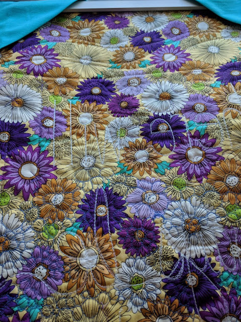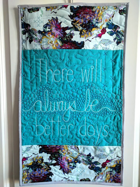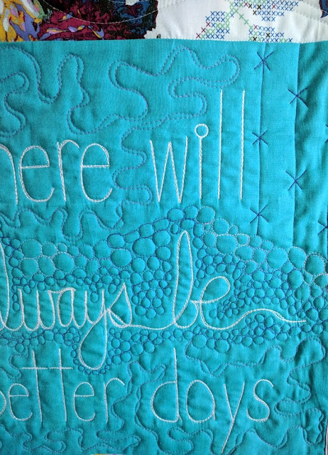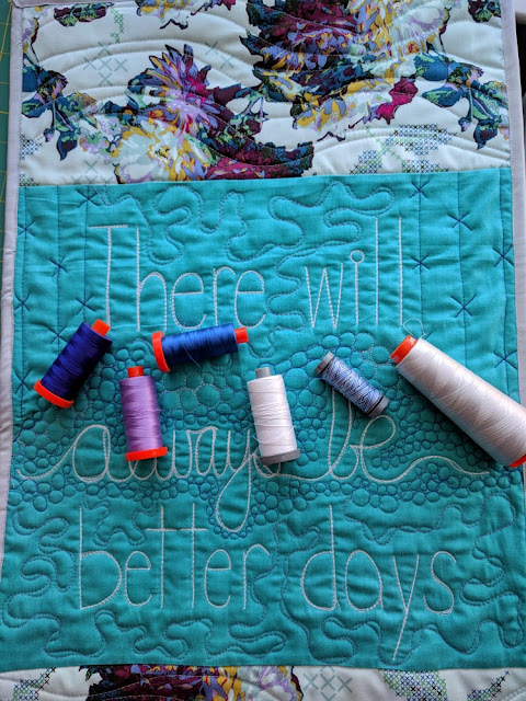 As I talked about in this post, it always takes some consideration to decide which fonts to quilt in and which threads to use. If it's a dark background, I want the words to be as bright/light as possible; the surrounding quilting can vary, as long as the quilting closest to the words isn't also a light color.