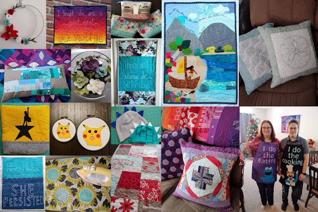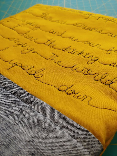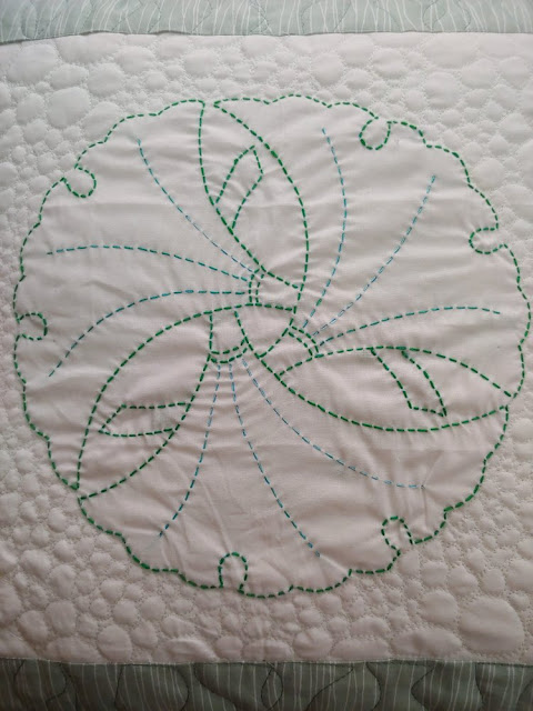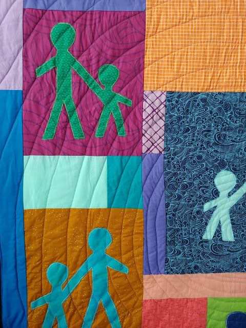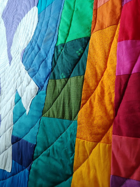 So, each block has pieces of the colors surrounding it, which makes it have a pixelated look. What I LOVE about planned improvisation is that there's always a plan, but I never know exactly what the quilt will look like when it's done. I also quilted each color differently (and into the next color) to further emphasize the transition. It was fun coming up with the various motifs and pairing up Aurifil threads: 1320, 4020, 1133, 2600, 1243, 1135, and 2605.