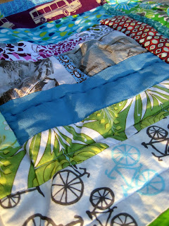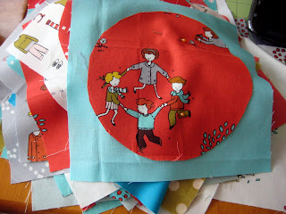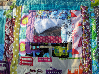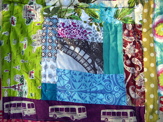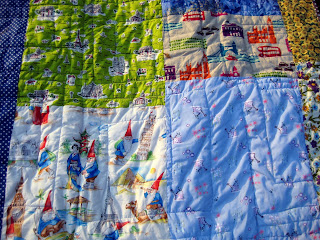 I ordered a bunch of Echino fabric from various etsy shops - trains, cameras, buses, the London print - as well fabric with a map of Paris, and Michael Miller Bicycles in Haze (she loves biking). London and Paris were her favorite cities. I also recently won two Lecien FQs from Kate - which was PERFECT - candy shop fabric (Julie went on a Harry Potter tour in London), and the other fabric said "Paris" all over it. How's that for timing??