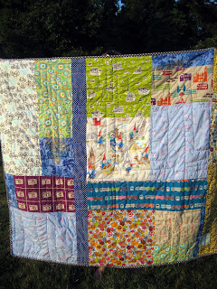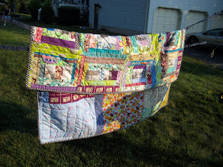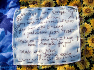 Quilted: On my Brother machine. I quilted in random squares and I LOVE how it came out!! It was hard though - quilts that are bigger than baby quilts are always... more difficult =P But I made it. The title, "Windows into Europe" was also inspired by the squares - as well as the fact that Julie loves taking pictures of windows =P I also hand quilted many of the solid strips.