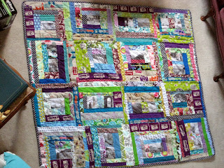 I chose log cabins in order to showcase the pictures as much as possible. Some of the log cabins were made wonky/differently - in order to put two pictures on one block. Each block took about 45 minutes to make.