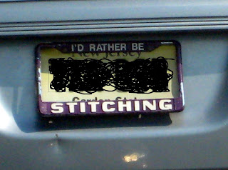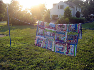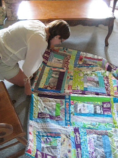 Last part of the story: As soon as the fabric I ordered arrived, Julie asked me to make her a T-shirt quilt! Gulp. She gave me her box of shirts, and we even went out and picked backing and binding fabric. I worked on the Europe quilt under the ruse of working on her other quilt... :) So yesterday I told her that her quilt was done...