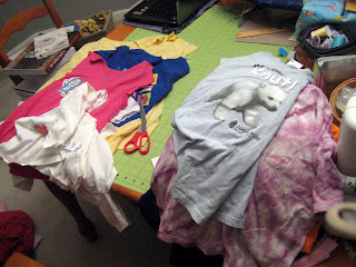 3. Place a piece of batting, cut the the same size as your blocks, on the table in front of you. Lay the "back" fabric" (aka, in my model, red, yellow, blue, pink) on top of the batting, face up. Lay the "front" fabric (cover, orange, green, purple) face down on top of the "back." It's like you're making a quilt sandwich. Pin in place.