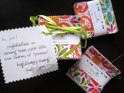 I don't know if she'll ever see this, but thank you so much to Kate and Fat Quarterly! I'm totally in love with Terrain (as well as, like, every other Kate Spain fabric, haha) and I cannot stop looking at how cute these mini charm packs are!