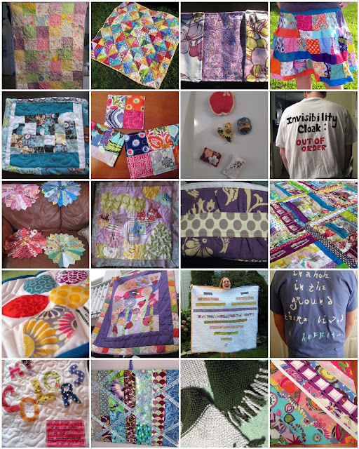 1. Baby Girl Quilt, 2. IMG_5259, 3. Passport Sleeve - inside, 4. Terrain Patchwork Skirt, 5. Scrappy blue mug rug, 6. Quilted thank you notecards, 7. Fabric Magnets, 8. Harry Potter Shirt, by Quiltyhabit, 9. Dresden Plates for Wedding Quilt, 10. Front - mug rug for Swap Adventure April 2011, 11. Purple clutch closeup, 12. Windows into Europe Photo Quilt, 13. IMG_4931, 14. IMG_4889, 15. IMG_5326, 16. Back of "The Hobbit" shirt, 17. Front cover of fabric baby book, 18. Purple and blue fabric bulletin board, 19. Slytherin house scarf closeup, 20. Heroes Helping Heroes block