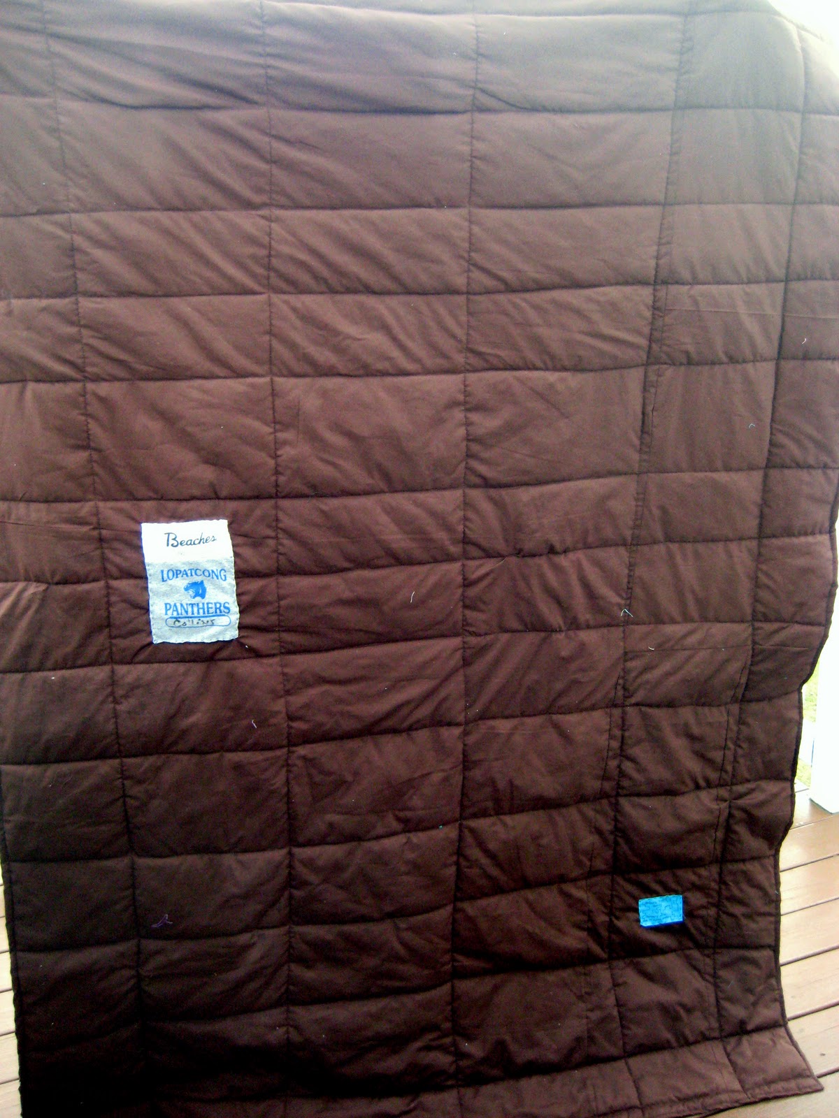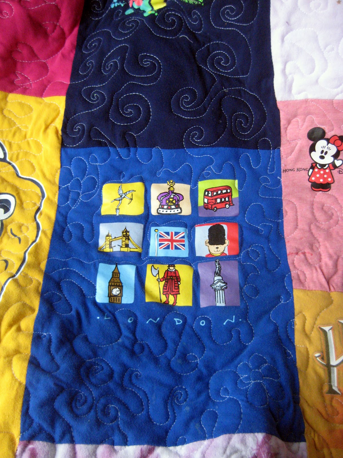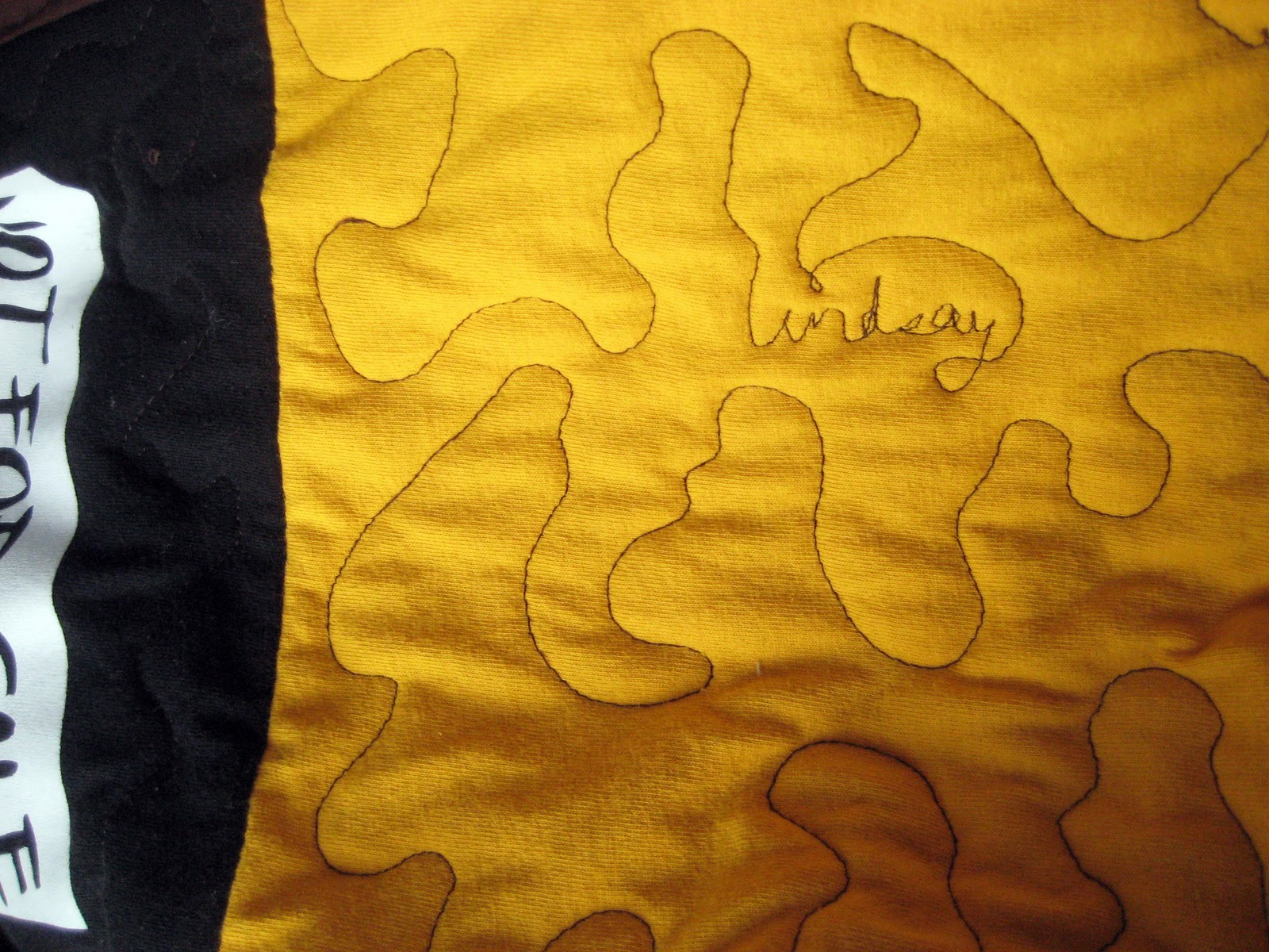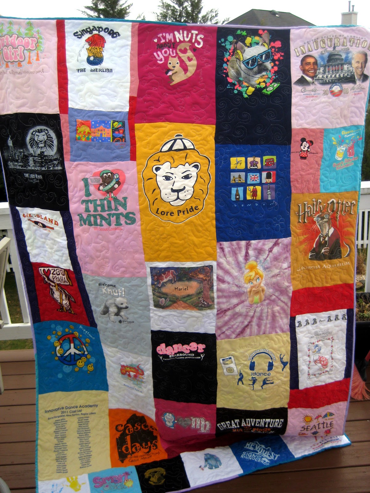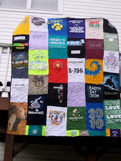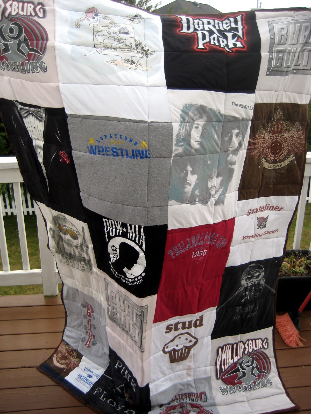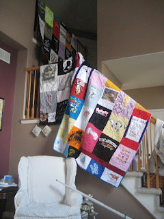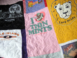 So, within the span of a month (way back in October), I got three commission t-shirt quilts. My first commissions. I need the money (I feel like I should wear a sign around my neck that says: "will quilt for money or fabric") so I agreed.