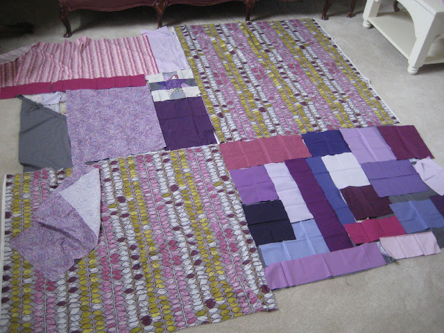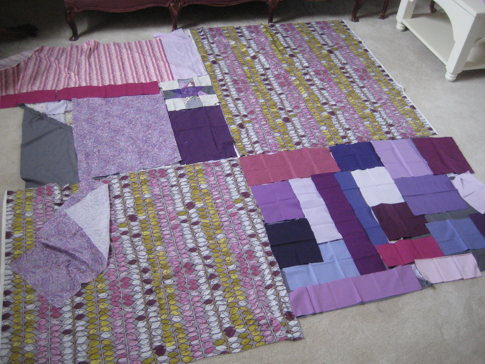 -View of the living room - piecing the back of my purple star quilt (it's going to change today)