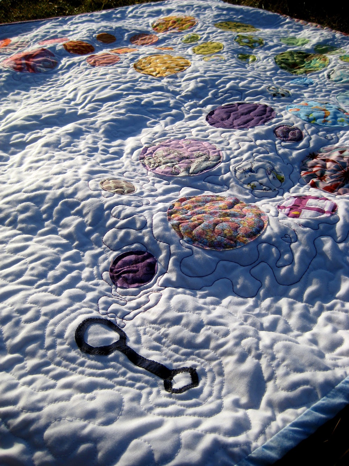 What I learned: I love using a neutral solid (in this case, the Kona white) as a dominant part of the quilt. Very modern, haha! When I thought of the bubble wand, I knew I couldn't ignore it; trust my instincts and it works! I also controlled my stippling better, and greatly enjoyed the effect of rainbow stippling on white (it's difficult to see but here's a picture of green and blue together):