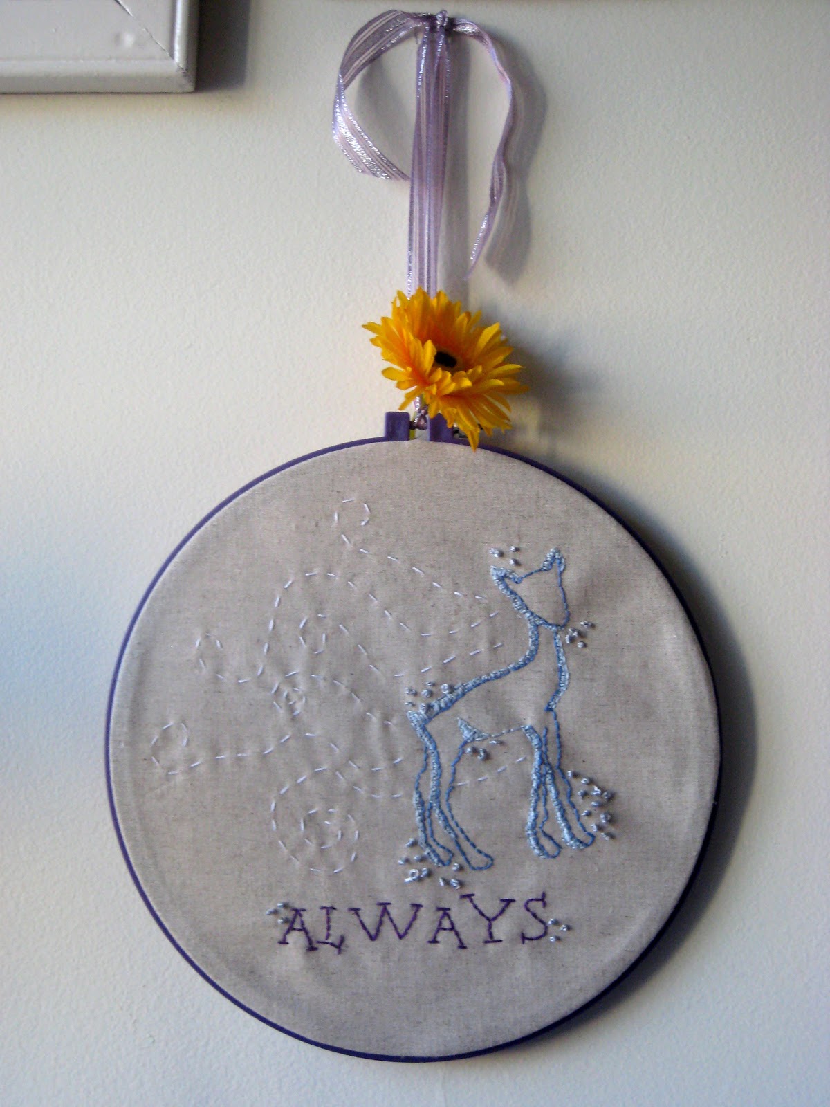 The beauty of this project is that you can use any color scheme at all, and it will look beautiful! I would LOVE to see one in purple, blue, and gray or white. Use yarn instead of ribbon. Even paper would work instead of fabric!