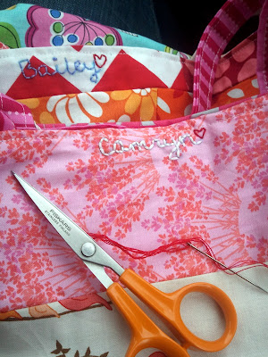 I sewed the strips together for the front, and I used Skip To My Lou's reversible tote bag tutorial. I picked fun fabrics for the backs. Then, I embroidered them on the