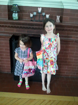 We were excited to be here for Easter, and especially to spend time with two of our lovely nieces (ages 5 1/2 and 2 1/2). I made them tote bags for spring. Our older niece loves rainbow (and pink), while the younger niece is obsessed with pink. I didn't have time to quilt them, but that's okay :)