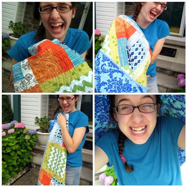 The blocks come together really easily. I wanted them to look like they were floating (I LOVE Tangled) (just click the link and watch the clip already! It's worth it!), so I placed them at different heights. Being the Kate Spain fabric-a-holic I am, I just couldn't let those extra jelly roll strips go to waste, so I decided to add them randomly as another modern element to the quilt. It makes it very assymetrical, and I love that. The other extra strips will go towards one more lantern on the back, and the binding.