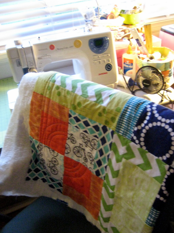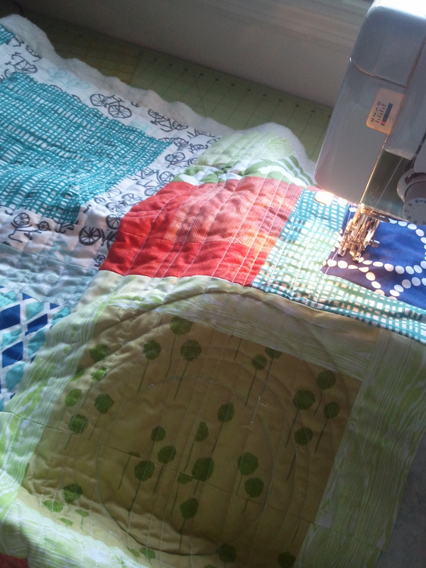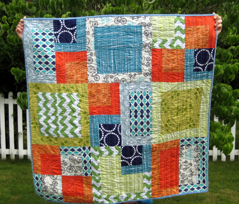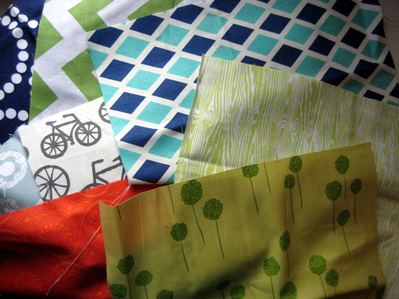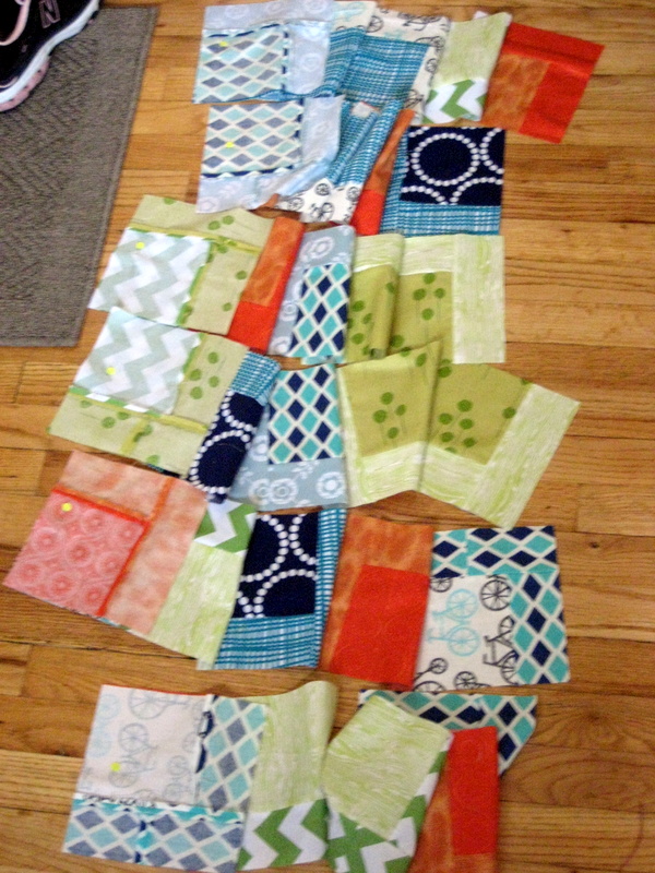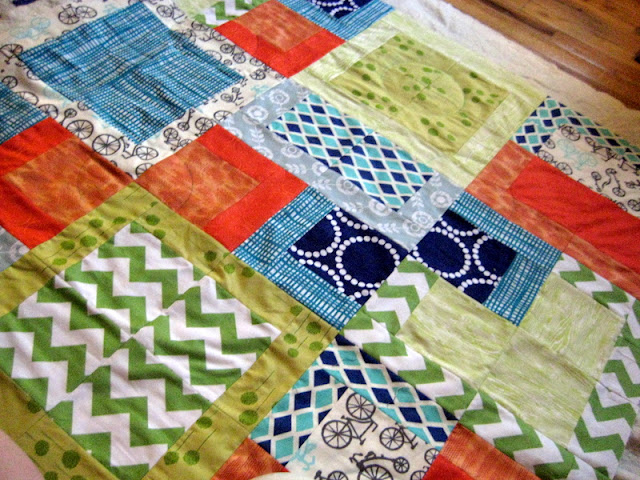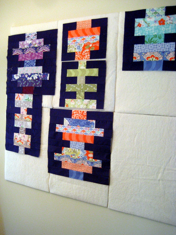 The blocks come together really easily. I wanted them to look like they were floating (I LOVE Tangled) (just click the link and watch the clip already! It's worth it!), so I placed them at different heights. Being the Kate Spain fabric-a-holic I am, I just couldn't let those extra jelly roll strips go to waste, so I decided to add them randomly as another modern element to the quilt. It makes it very assymetrical, and I love that. The other extra strips will go towards one more lantern on the back, and the binding.