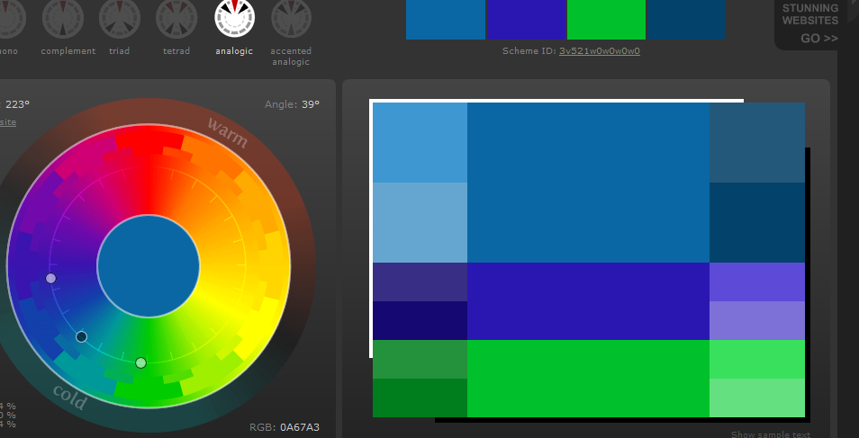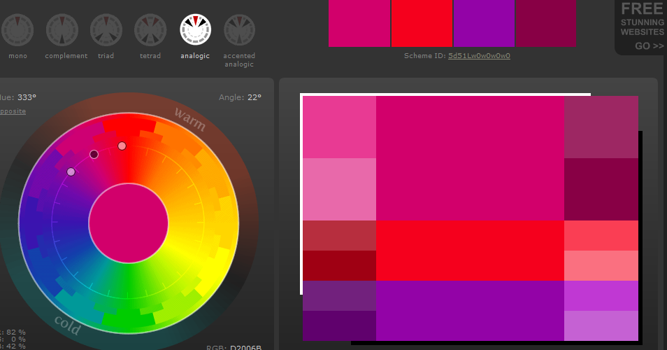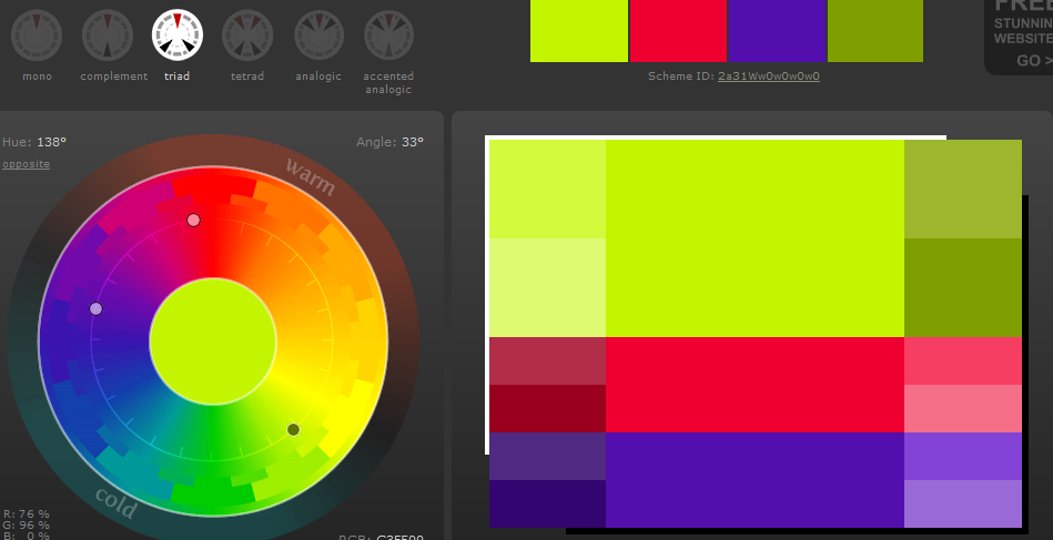 A note - Color Scheme Designer 3 is my go-to tool online for quilty color schemes. All the pictures are screenshotted (screenshot?) from this fabulous website. You can actually click the buttons to show you the combinations I'll demonstrate, and then whirl the color wheel around to your liking - how nifty is that? Okay, go play for a minute, then rejoin me here :)