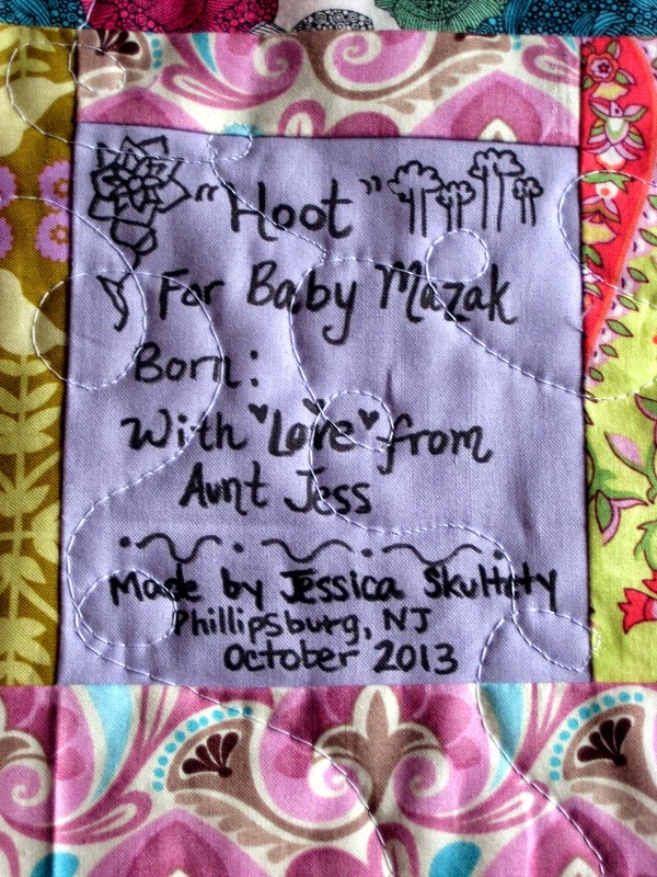 ReplyDeleteYou did a fantastic job, Jessica! I love the tree with the purples and the owl adds the perfect focal point. Sorry to hear about the quilting issue! I will remember that next time my machine throws a hissy fit (due back from the shop for a tune up tomorrow--it seems to go in about once a year, bleck). I'm sure baby girl will be delighted with it!