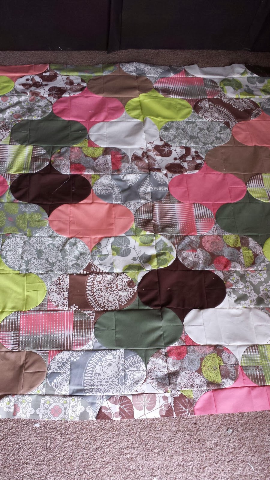 Your finished top looks great and well worth the time you spent piecing all those curves! I wonder if you just straight line quilted edge to edge.... Spaced about 1" apart or alternating 1" and 1.5" apart? I'm sure whatever you decide it will be fab!