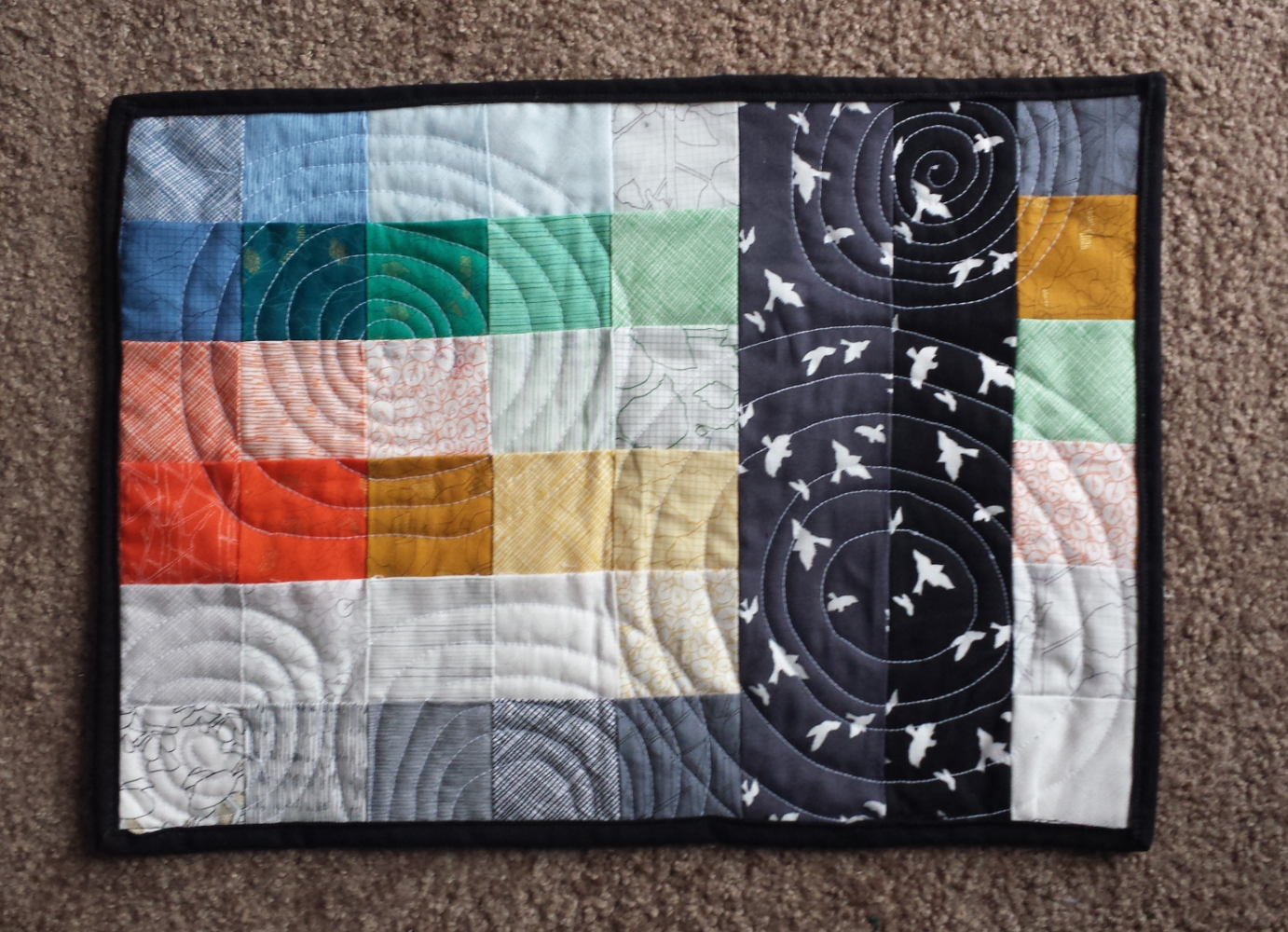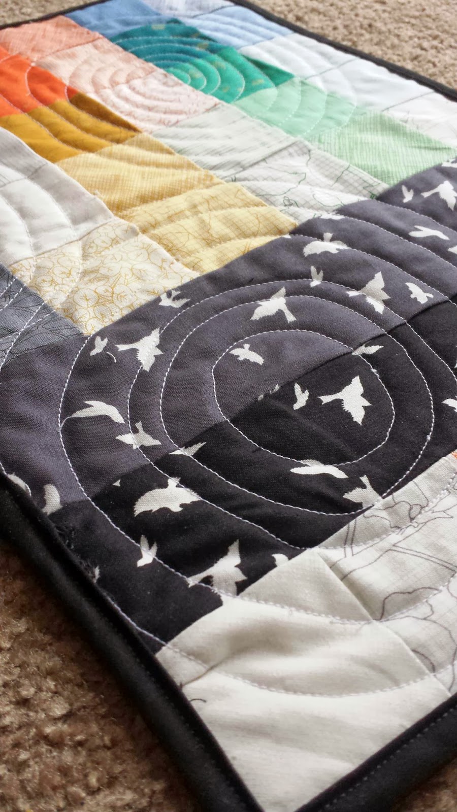 It was still missing something, so I added in two shades of the bird print from Waterfront Park, and I'm so glad I did that! Then, I quilted in different kinds/sizes of circles, to offset all the angles. I used my FMQ/darning foot for the spirals, and my walking foot for the separating/overlapping circles (see my tutorial here if you are interested). To me, it looks like the birds are flying in circles.