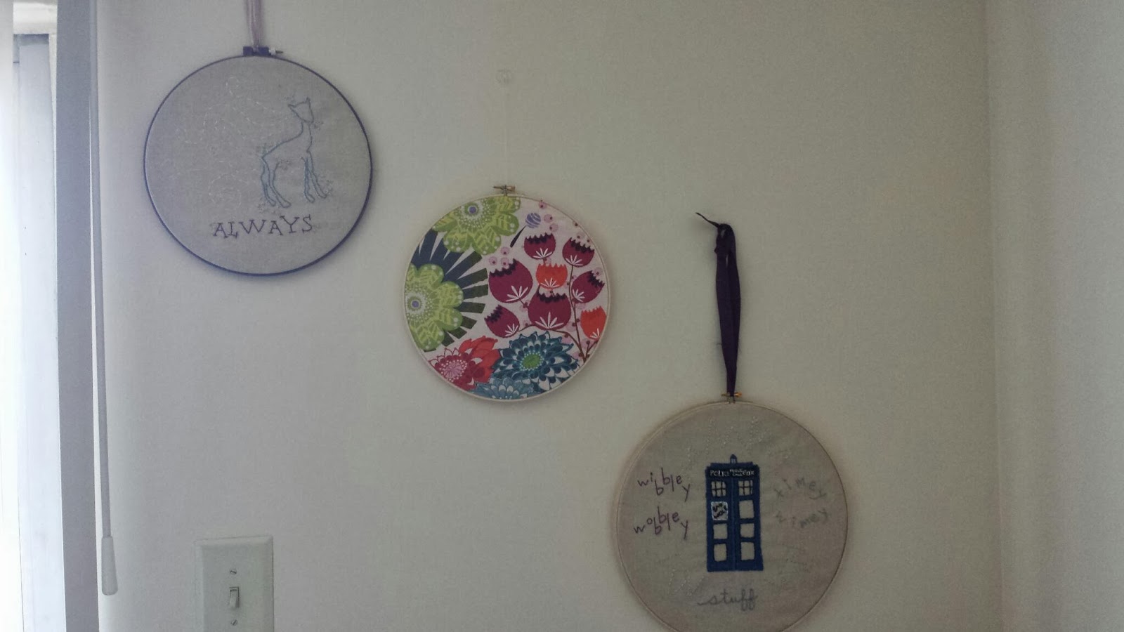 Now I have a nice wall of hanging embroidery. I'll be sharing some embroidery hoop decorations next week (they're elsewhere in the apartment, too :) ).