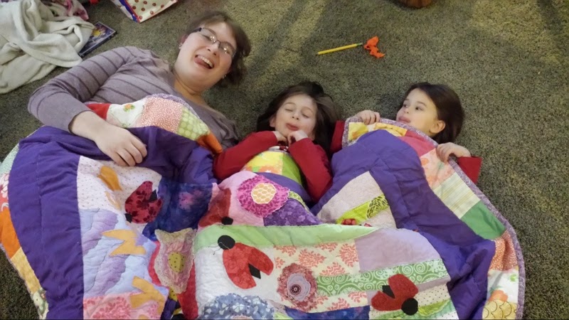 Curled up with my nieces on our recent trip to Maine :) This is one of the first quilts I ever made - it's my oldest niece's.