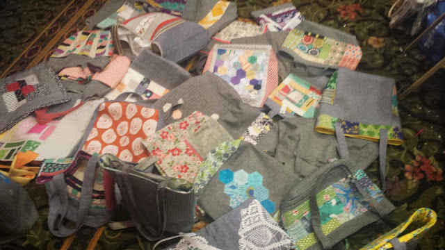 part of the night. Quilters made tote bags using Essex Linen from Robert Kaufman (thank you!!!) and places them in bags for disguise. The organizers handed out the