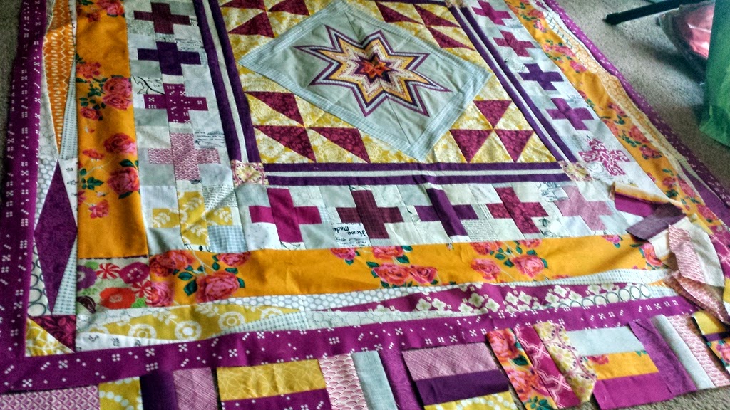 The backing is a rainbow of many Botanics scraps with some sketch and nature prints, Ty Pennington prints, and even a chunk of Anna Maria Horner needleworks on the right/middle!