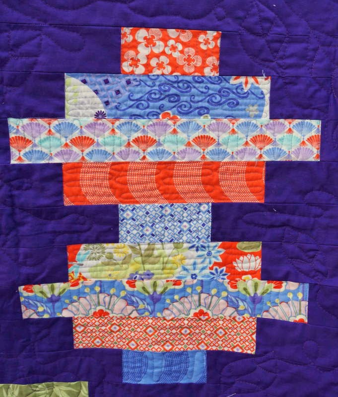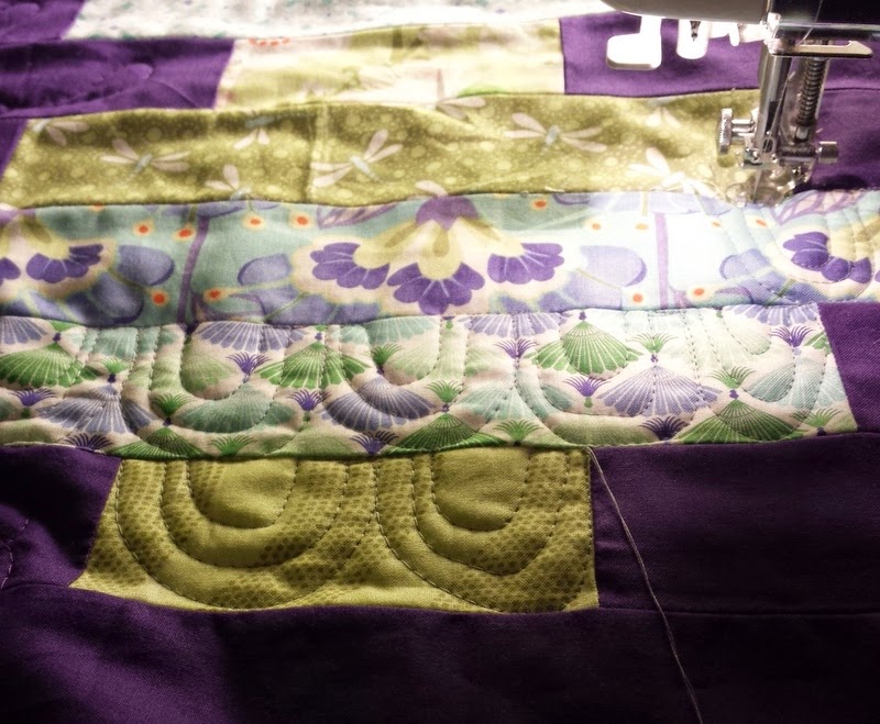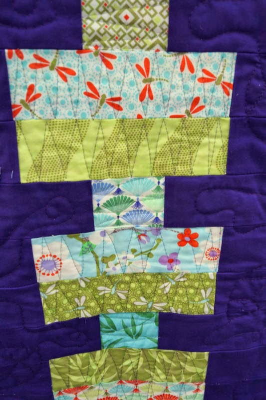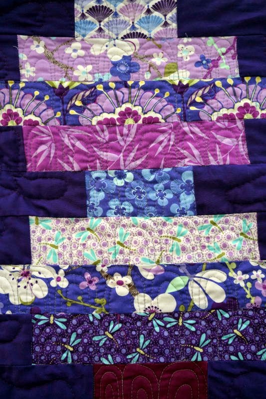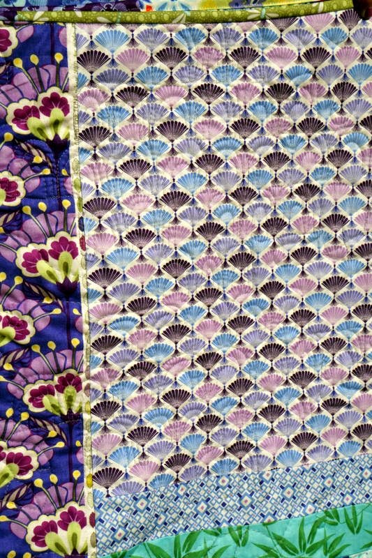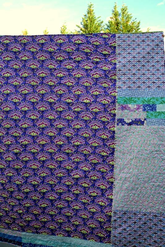 The backing is made from a large piece of Good Fortune found at Burkholder's Fabrics earlier this year and more yardage/strips from the line. You can never have enough purple in this house. I even left the selvage in because I cannot get over those fans. See them peeking through? :)