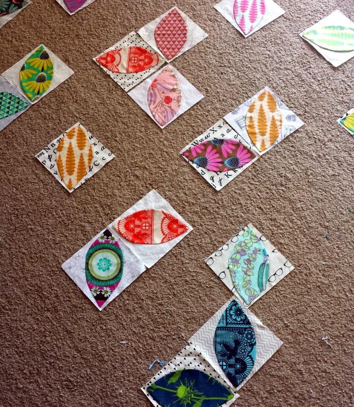 5. At the end, you can quilt down your peels in whatever way, or you can machine or hand applique. If your iron was hot enough, your peels will stay down for a time, but to ensure that they do long term, stitching them down in some way is an important step. I am top-stitching the orange peels down (as Emily also suggests) by starting at the middle of the orange peel (it's easier than starting at the tip in my opinion) with a 3.0 stitch length very close to the edge (less than 1/8th of an inch).
