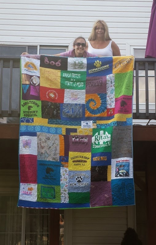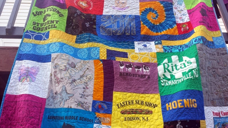 I gave her a "coupon" for a t-shirt quilt in 2010 (that expires in 2070 apparently - snort!) and she gathered her t-shirts together early last summer. That means they'd been sitting in my closet in a bag for over a year. Ris told me earlier this summer that she really enjoyed arranging her photos randomly on her wall... and the light bulb went off! I convinced Marisa to come and arrange the whole quilt (that's always the most time-consuming part for me). We got together for a couple of days and finished the top.