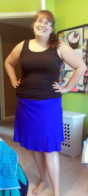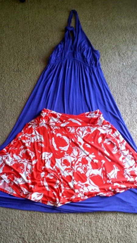 I successfully altered two pairs of work pants earlier in the year, and this was just the next logical step: take a purple maxi dress (it's too big and I never wear it anymore), shorten it up, and create a cute roll-over jersey skirt to wear around the house. Doable, no?