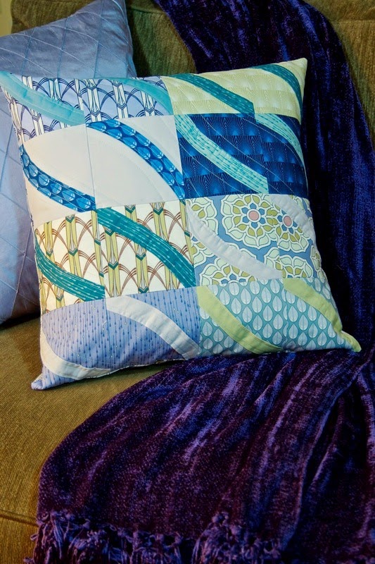 For the back of the table runner, I pieced together my blue and teal scraps to make some improvisational curves In case you didn't already notice, I love to make quilts double-sided so they serve a double purpose. Now I have the same opportunity with this table runner. I see myself using this side in the summer! You can see from the above picture to the one below how the Oakshott colors change depending on the light and where you stand in the room. Seriously amazing! Oh, and I love how the quilting from the front made hexagons on the back. :)