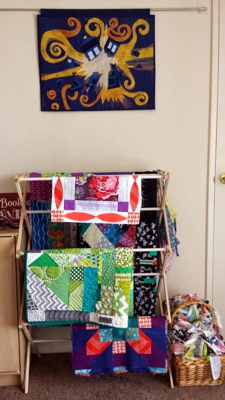 After seeing my crazy pile of WIPs on the couch, some friends on Instagram helped me brainstorm new, easy options. Stacey (@staceyinstitches) suggested I use a drying rack. I had one in my closet that I hardly ever use. Boom! Instant pretty organization. I have a couple of finished minis laying on there, plus Supernova blocks, my petal medallion starter, progressive bee quilt, and AMH medallion top. Muuuch better!