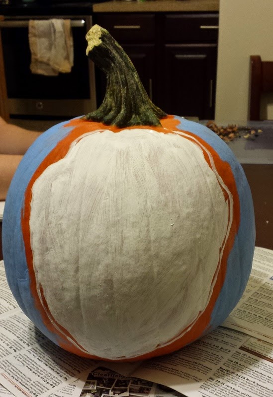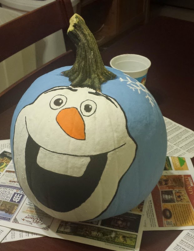 Mike and I are combining our artsy skills to paint a pumpkin for a work contest. I worked on the background and a couple of snowflakes so far, and he painted all the facial details. Mike's talent is amazing.The stem is supposed to be hair! "Do you want to build a snowman?" Maybe one day we can make a quilt together. Or is that wishful thinking? :D