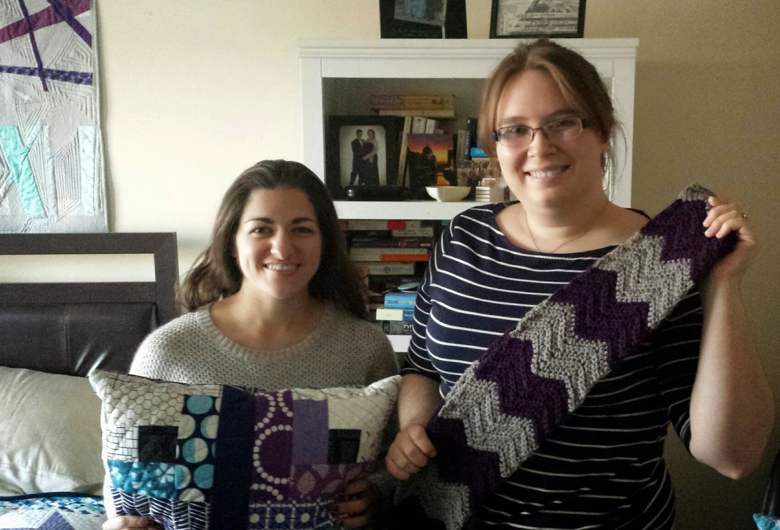 This was a fun, satisfying project that didn't feel like an obligation. For my beautiful friend, it was worth the time and materials. Check out the lovely purple and gray chevron scarf she made me! It's totally my style and I've been wearing it every day to work!