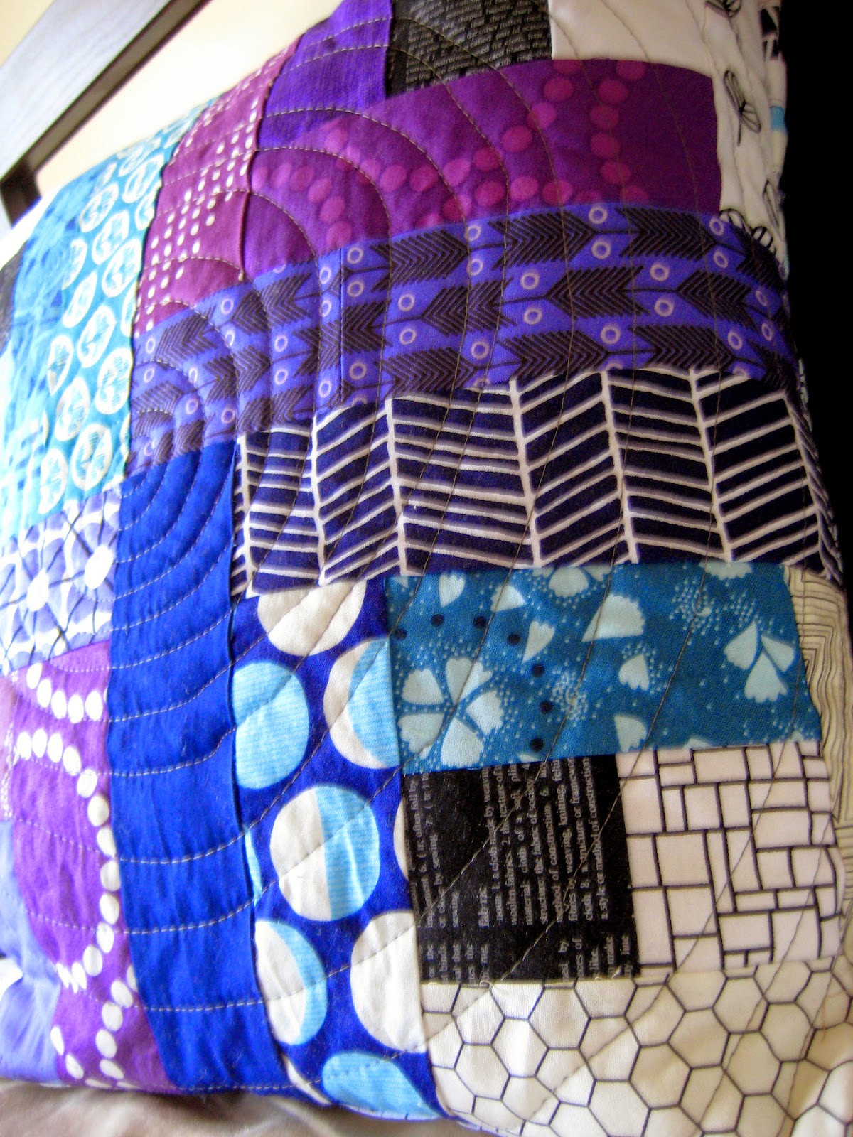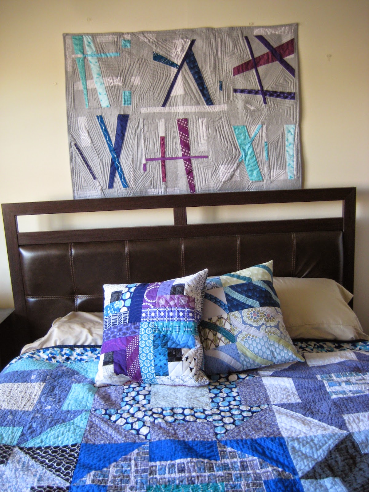Finally, I couldn't help taking a bunch of pictures of our bedroom. I just hung up Pixie Sticks, and my husband's Doctor Who quilt and my Improv Wave pillow just fit in so nicely with this purple and blue log cabin experimental pillow... can you tell we love blue and purple around here?