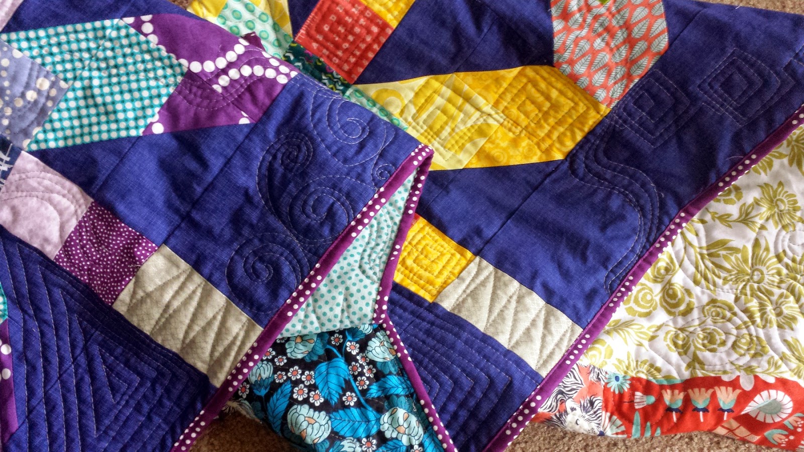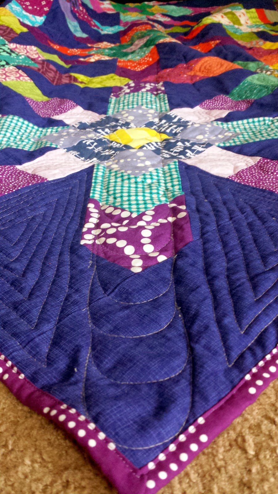 As I mentioned earlier this week, I quilted so that the center supernova exploded to the ends of the quilt in all directions; I used large pebbles for the horizontal and vertical lines, and repeating arcs on the diagonals. The other supernovas are quilted individually in one of three designs: spirals, squares, and waves. I made sure to continue the quilting into the borders to maintain the exploding illusion. Then, I felt like it needed one more element (what can I say, I quilt quilts to death), so I quilted 8 diamonds in the middle Xs that the supernovas create. I discovered such joy in quilting this quilt. This process included a few very late nights because I was so wrapped up in what I was doing. I can only wish that others have or can find that feeling within their own hobbies. It was euphoric.