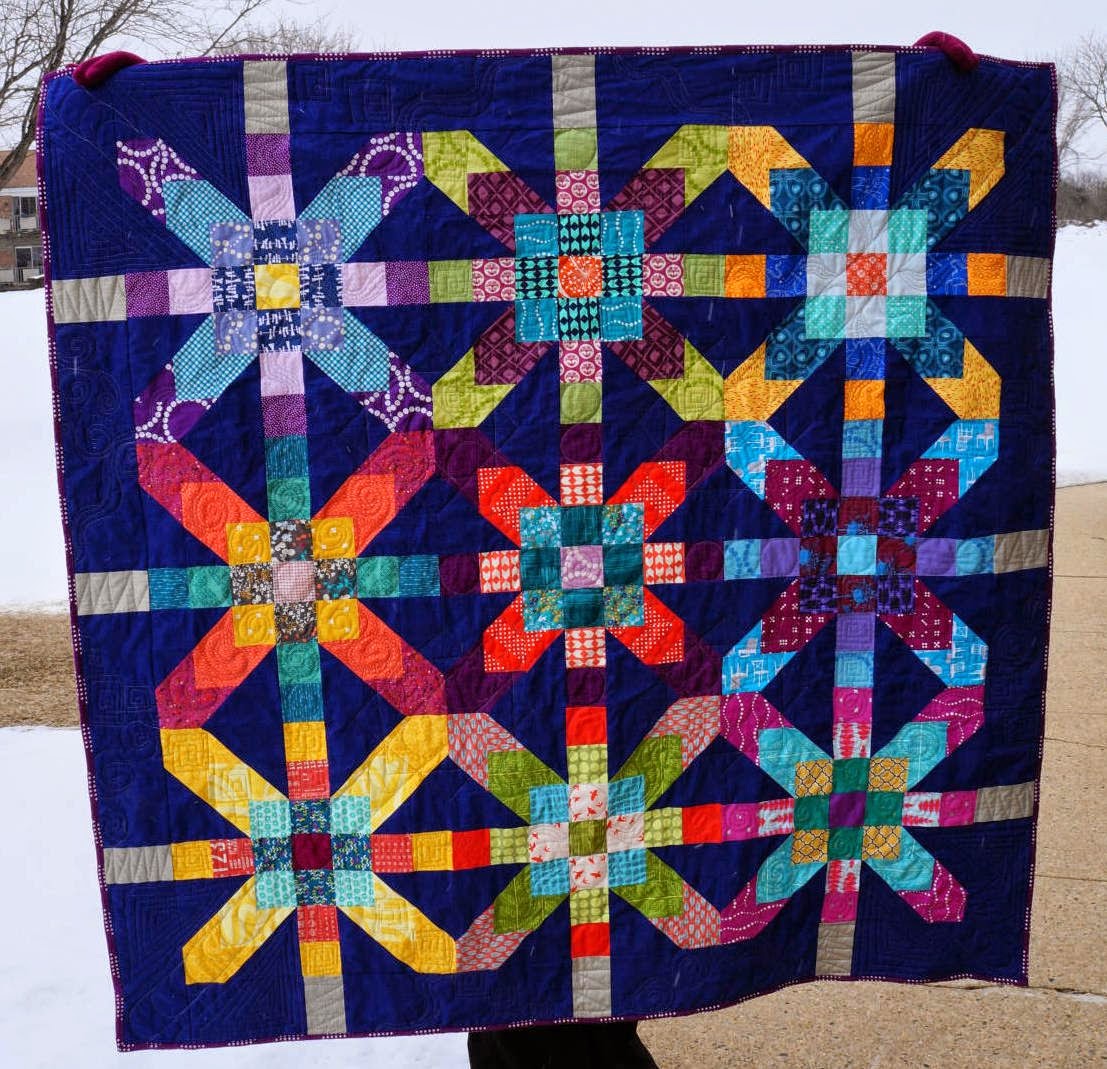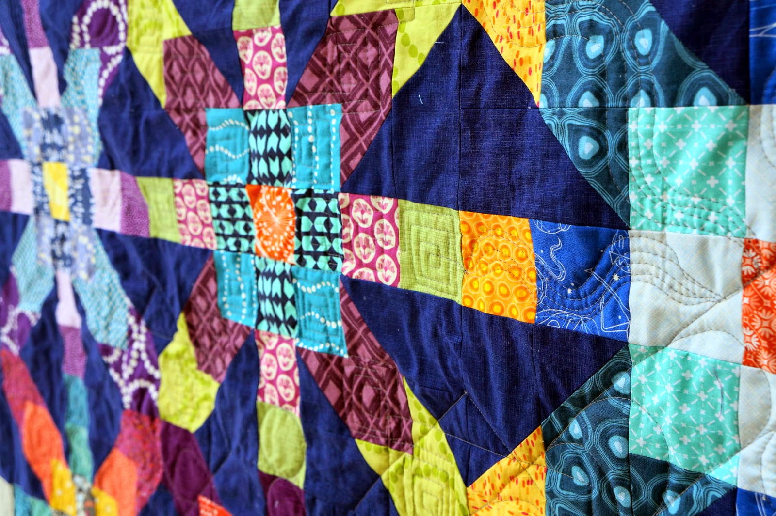 As I mentioned earlier this week, I quilted so that the center supernova exploded to the ends of the quilt in all directions; I used large pebbles for the horizontal and vertical lines, and repeating arcs on the diagonals. The other supernovas are quilted individually in one of three designs: spirals, squares, and waves. I made sure to continue the quilting into the borders to maintain the exploding illusion. Then, I felt like it needed one more element (what can I say, I quilt quilts to death), so I quilted 8 diamonds in the middle Xs that the supernovas create. I discovered such joy in quilting this quilt. This process included a few very late nights because I was so wrapped up in what I was doing. I can only wish that others have or can find that feeling within their own hobbies. It was euphoric.