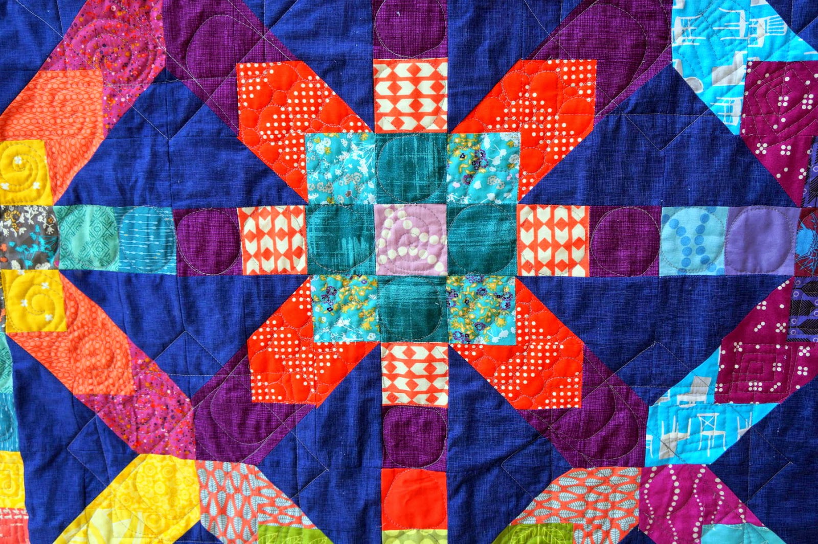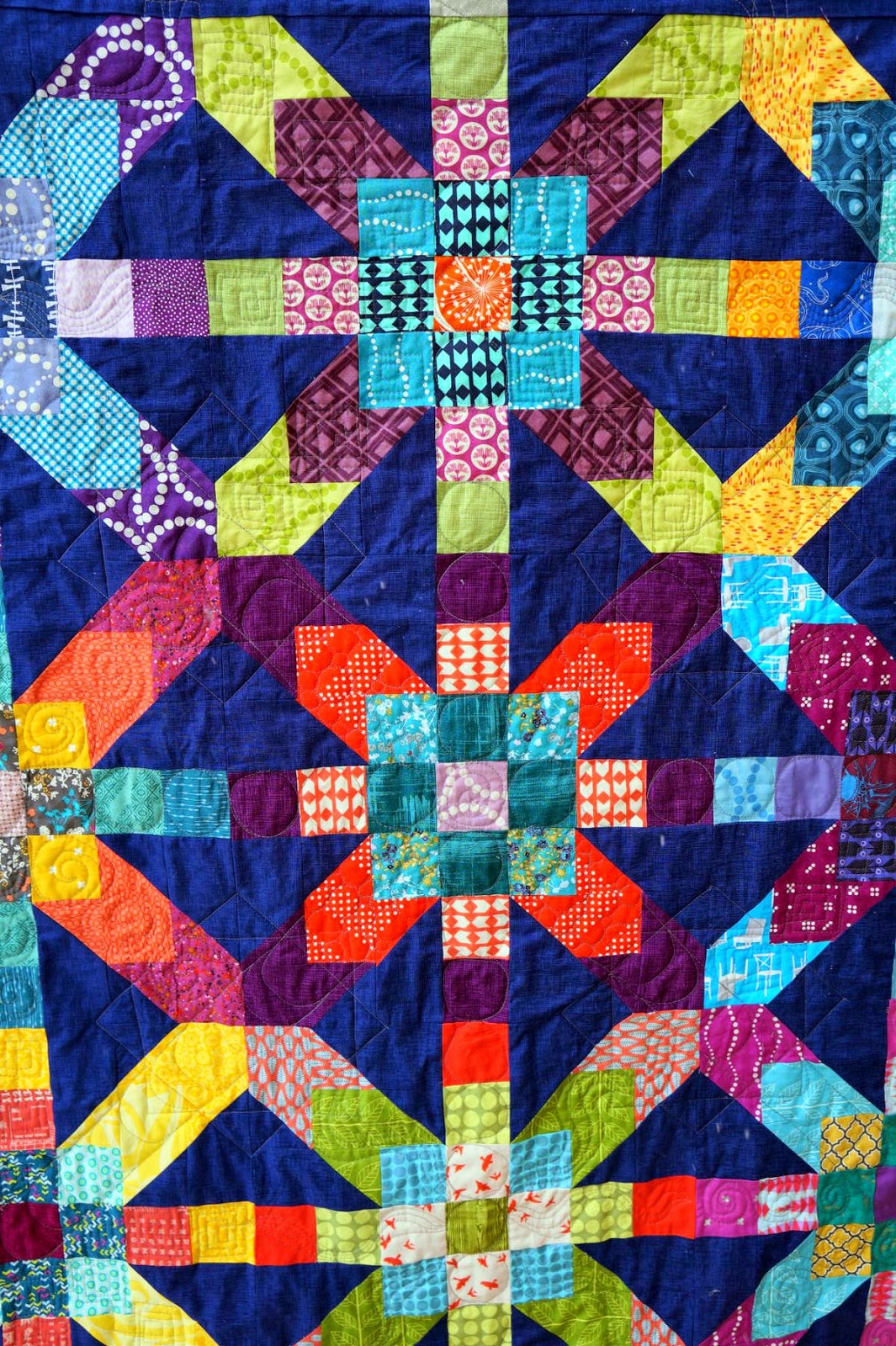 Stunning! Beautiful! I love it. The saturated colours of this quilt make my heart sing, and the blue background just works so well!