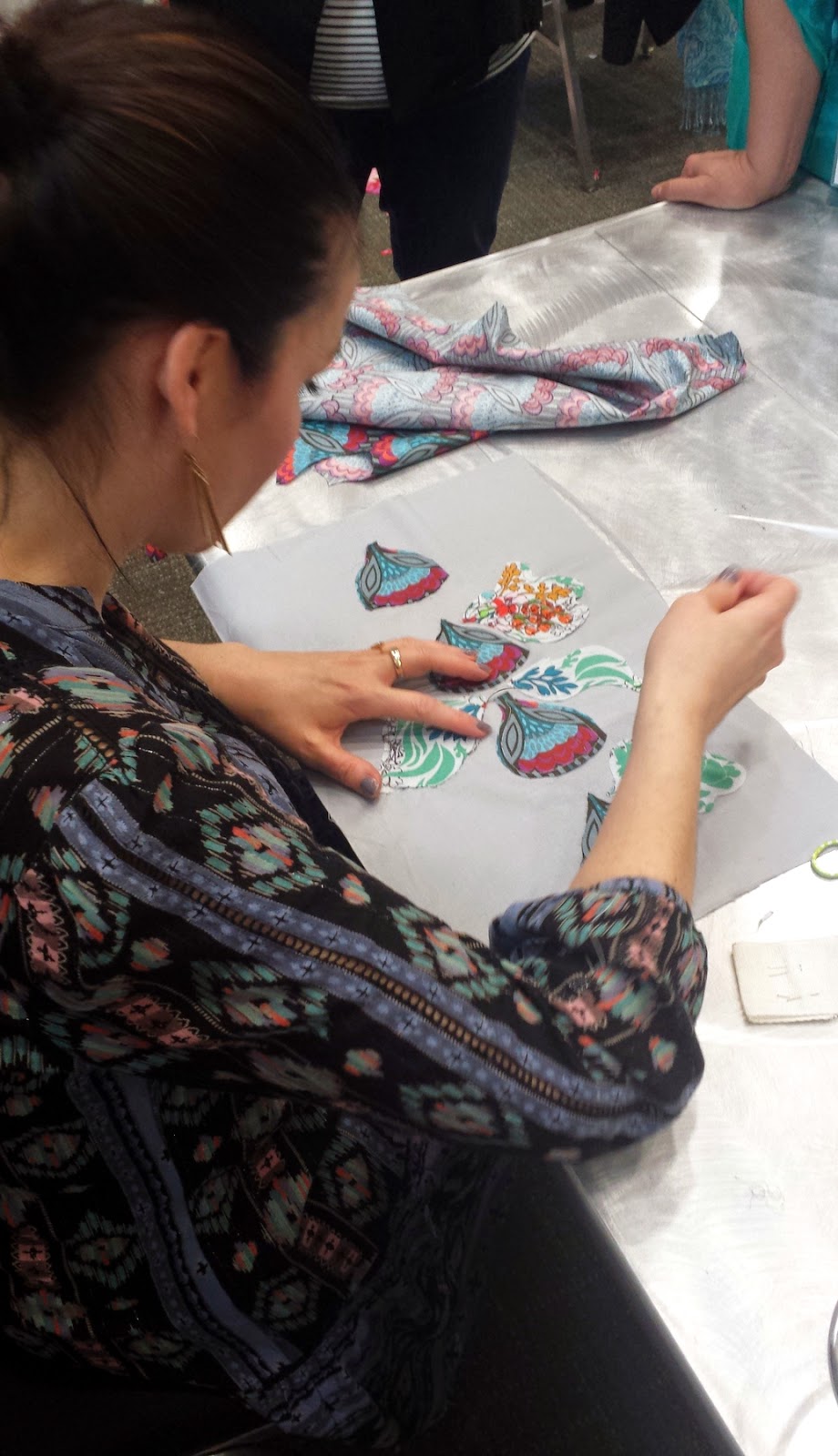 I'm not one much for handwork, but I can appreciate it. Anna Maria brought us aside in small groups to teach needleturn applique. I will definitely try it as I advance my design. I want to include some of those beautiful large flowers from her fabrics, and cutting them up isn't always okay!