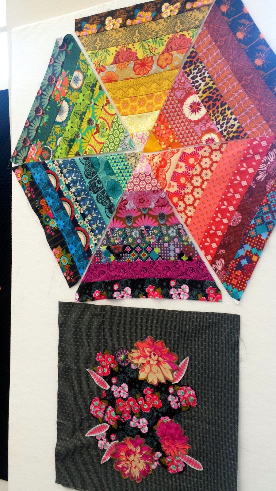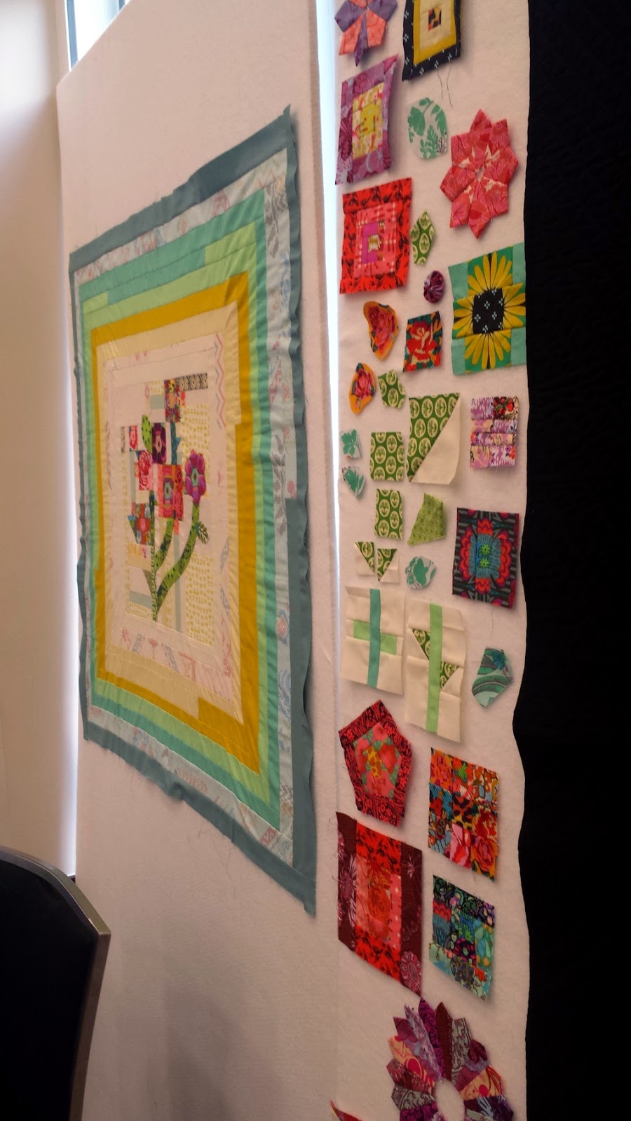 As much as I love machine appliqued orange peels, I love improvisational piecing even more! I took on the challenge to create a trellis-like flower vine using improv piecing. I'll add in much more white and couple of bias stems to make it look more like a vine. I'm so excited to keep working on it! Like my glittery washi tape improvised design (literally) wall? There were times where I could have used more direction and advice, and everyone was so busy with their creations that I shied away from asking. That's okay, though. As you can see, I haven't pieced much together yet; I spent a lot of time making flowers (some of which you don't see here).
